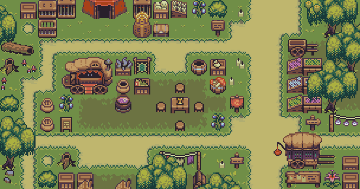 The re-upload version of Magic Market asset pack with less restrictive CC license. The tileset that can be be used to create 2D topdown RPG games. The theme is a magical market, the bazzar is set in deep swampy forest with magical plants and among ancient runes. Witches and sorcerers come to sell off their goods such as potion ingredients, magic wands, scrolls, and etc.